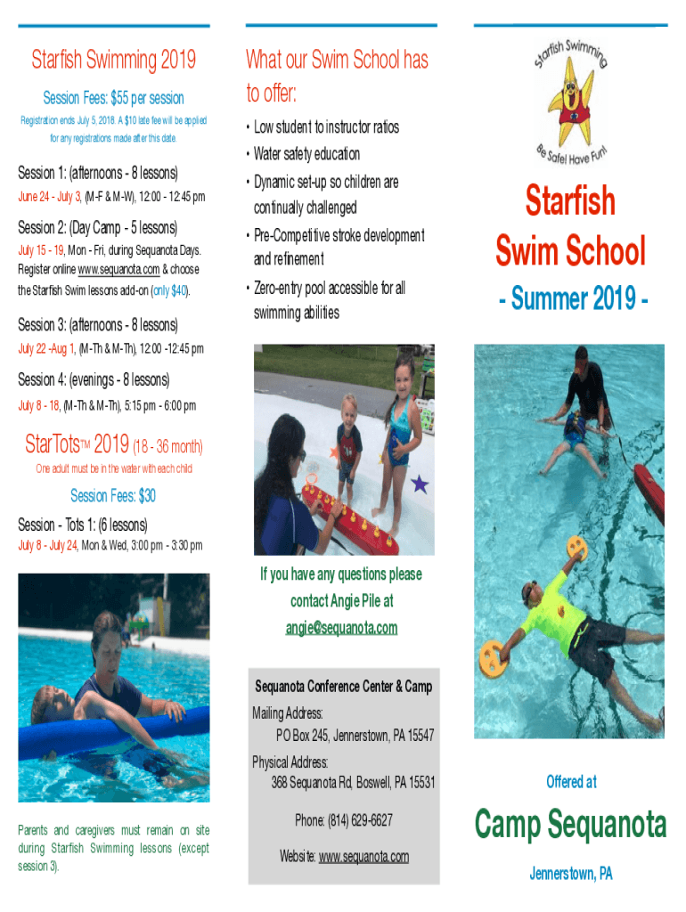 Starfish Swimming 2019 Session Fees: $55 per session Registration ends July 5, 2018. A $10 late fee will be applied for any registrations made after this date.Session 1: (afternoons 8 lessons) June