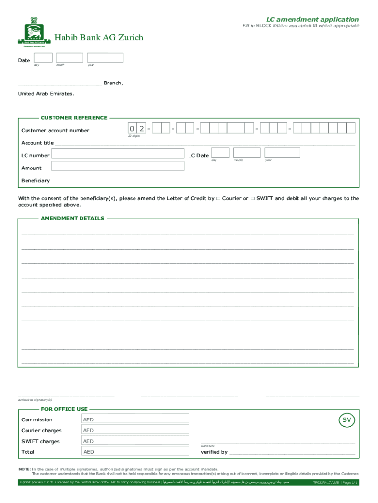 LC amendment applicationFill in BLOCK letters and check where appropriateHabib Bank AG Zurich Datedaymonthyear___ Branch, United Arab Emirates.CUSTOMER REFERENCE Customer account number0 222 digitsAccount