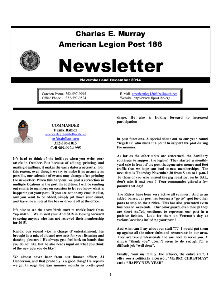 Charles E. Murray American Legion Post 186Newsletter November and December 2014Canteen Phone 3525979995 Office Phone 3525979524EMail americanleg186@bellsouth.net Website http://www.flpost186.orgshape.