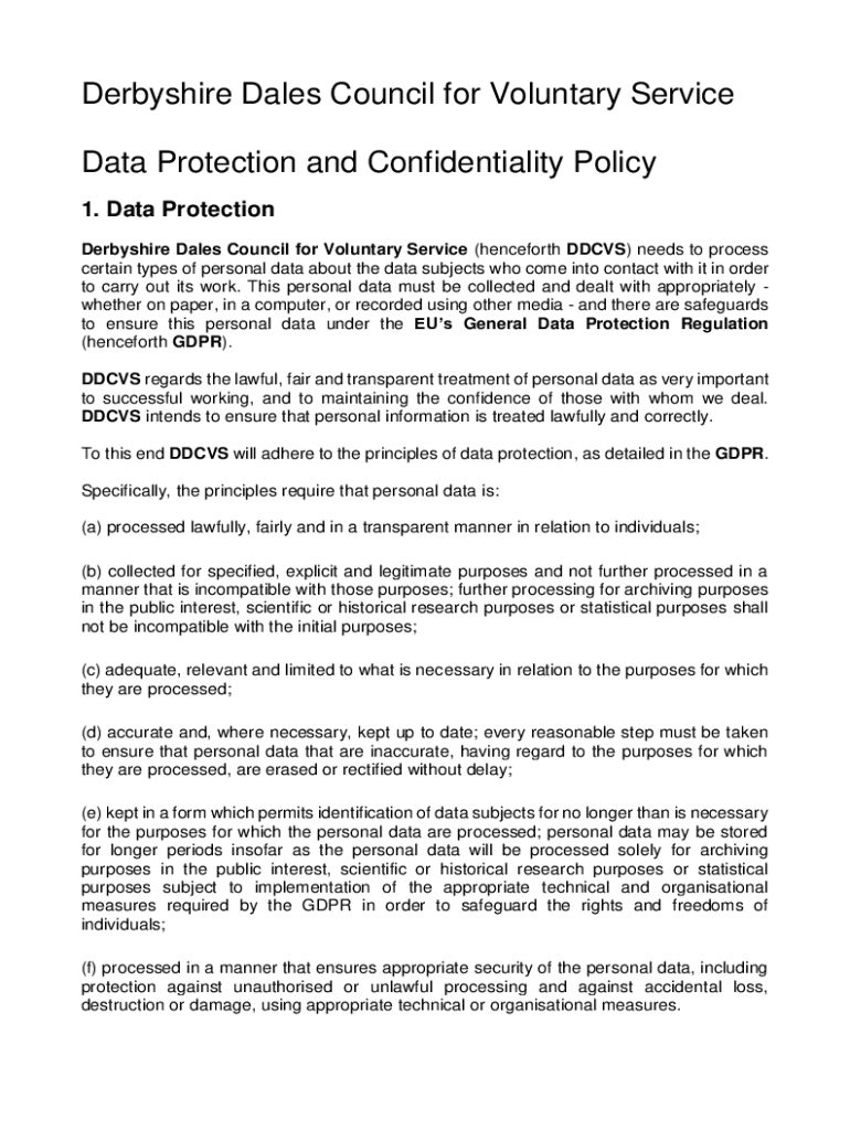 Derbyshire Dales Council for Voluntary Service Data Protection and Confidentiality Policy 1. Data Protection Derbyshire Dales Council for Voluntary Service (henceforth DDCVS) needs to process certain