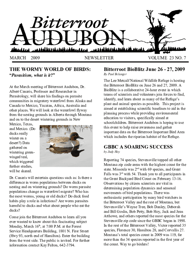 MARCH2009NEWSLETTERVOLUME 23 NO. 7THE WORMY WORLD OF BIRDS:Bitterroot BioBlitz June 26 27, 2009Parasitism, what is it?By Paul BelangerAt the March meeting of Bitterroot Audubon, Dr. Albert Canaris,