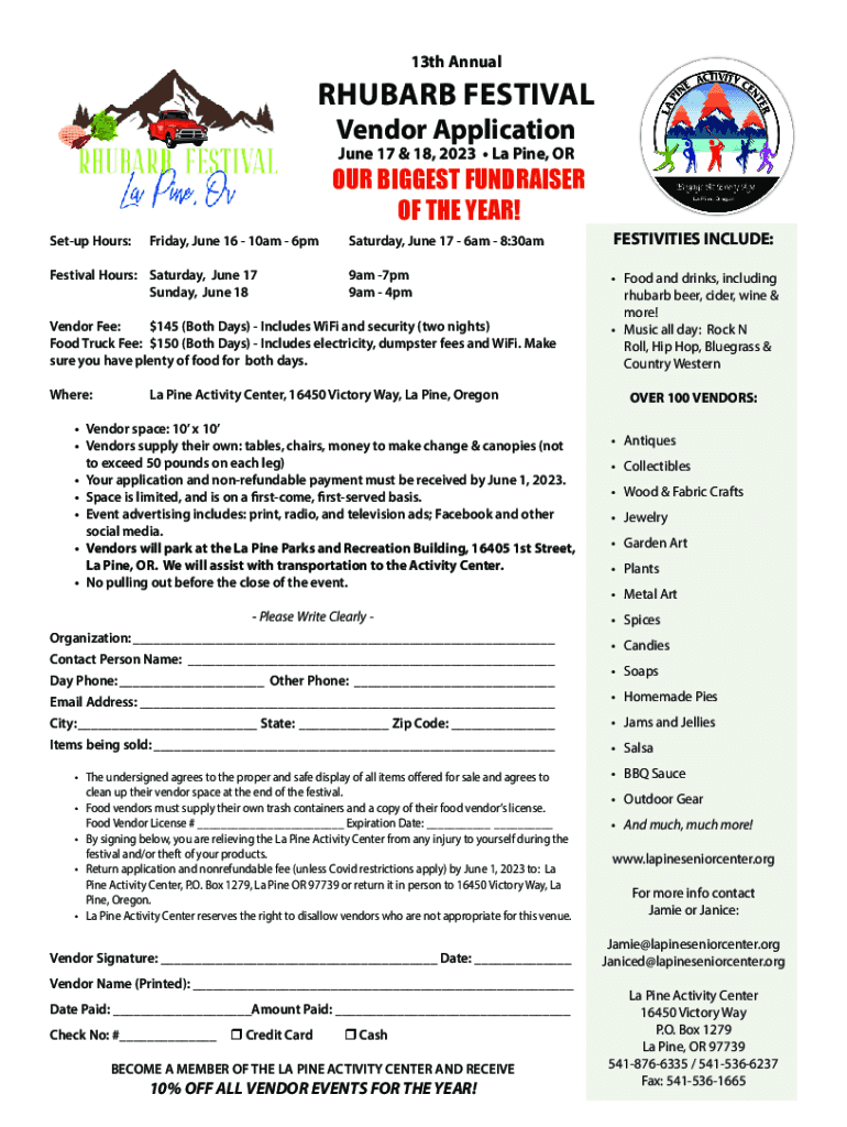 13th AnnualRHUBARB FESTIVAL Vendor Application June 17 & 18, 2023 La Pine, OROUR BIGGEST FUNDRAISER OF THE YEAR! Setup Hours:Friday, June 16 10am 6pmFestival Hours: Saturday, June 17 Sunday, June