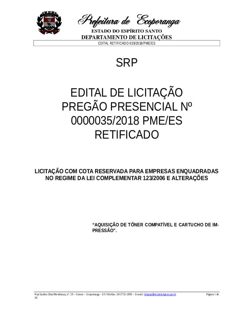 ESTADO DO ESPRITO SANTODEPARTAMENTO DE LICITAES EDITAL RETIFICADO 035/2018/PME/ESSRP EDITAL DE LICITAO PREGO PRESENCIAL N 0000035/2018 PME/ES RETIFICADO LICITAO COM COTA RESERVADA PARA EMPRESAS ENQUADRADAS