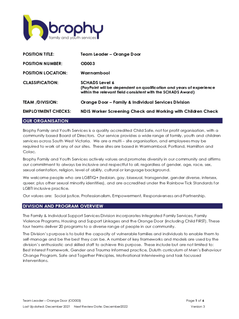 POSITION TITLE:Team Leader Orange DoorPOSITION NUMBER:OD003POSITION LOCATION:WarrnamboolCLASSIFICATION:SCHADS Level 6 (PayPoint will be dependent on qualification and years of experience within the