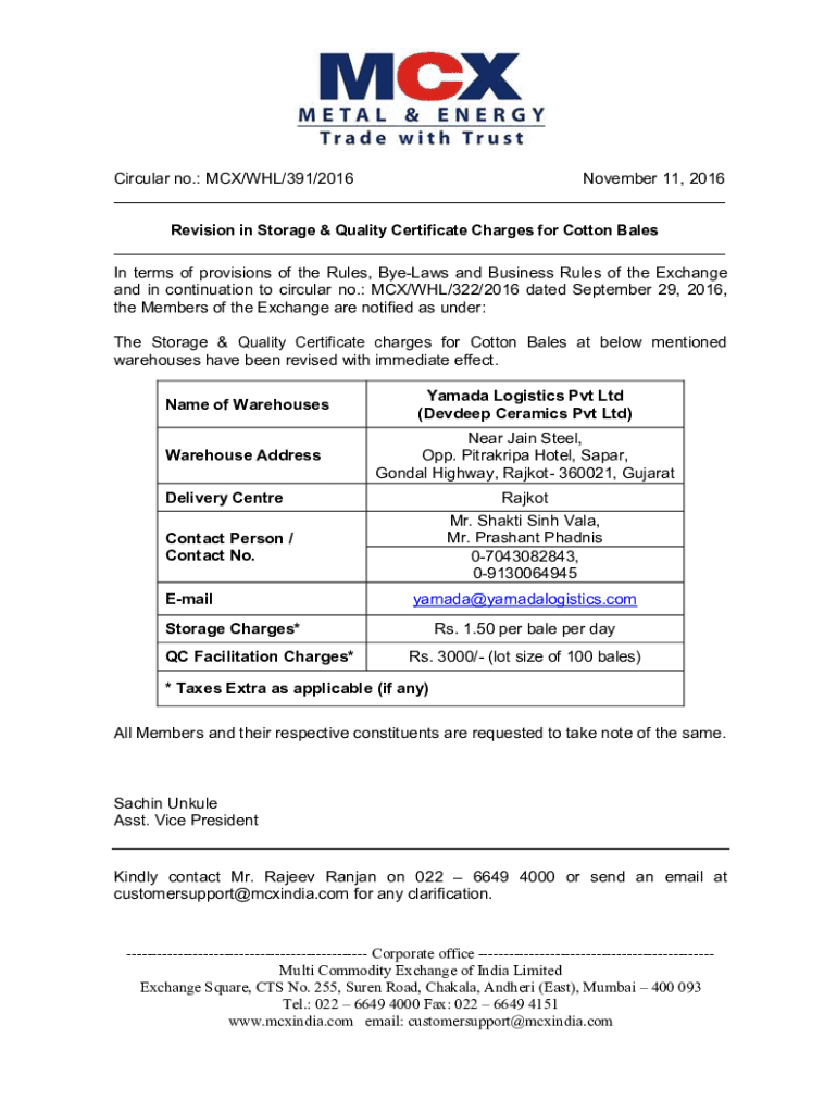 Circular no.: MCX/WHL/391/2016 November 11, 2016 ___ Revision in Storage & Quality Certificate Charges for Cotton Bales ___In terms of provisions of the Rules, ByeLaws and Business Rules of the Exchange