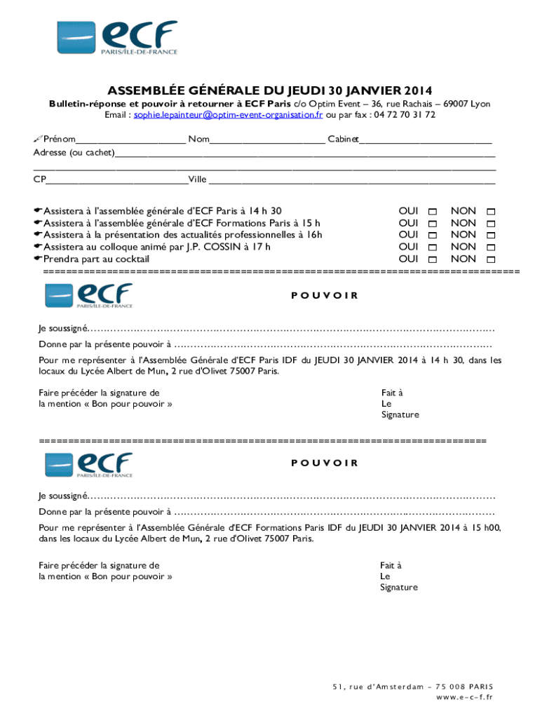 ASSEMBLE GNRALE DU JEUDI 30 JANVIER 2014 Bulletinrponse et pouvoir retourner ECF Paris c/o Optim Event 36, rue Rachais 69007 Lyon Email : sophie.lepainteur@optimeventorganisation.fr ou par fax : 04