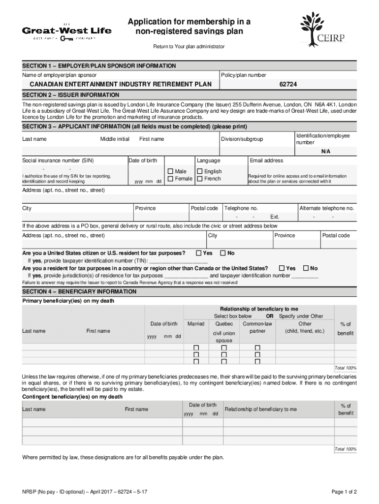 Application for membership in a nonregistered savings plan Return to Your plan administratorSECTION 1 EMPLOYER/PLAN SPONSOR INFORMATION Name of employer/plan sponsorPolicy/plan numberCANADIAN ENTERTAINMENT