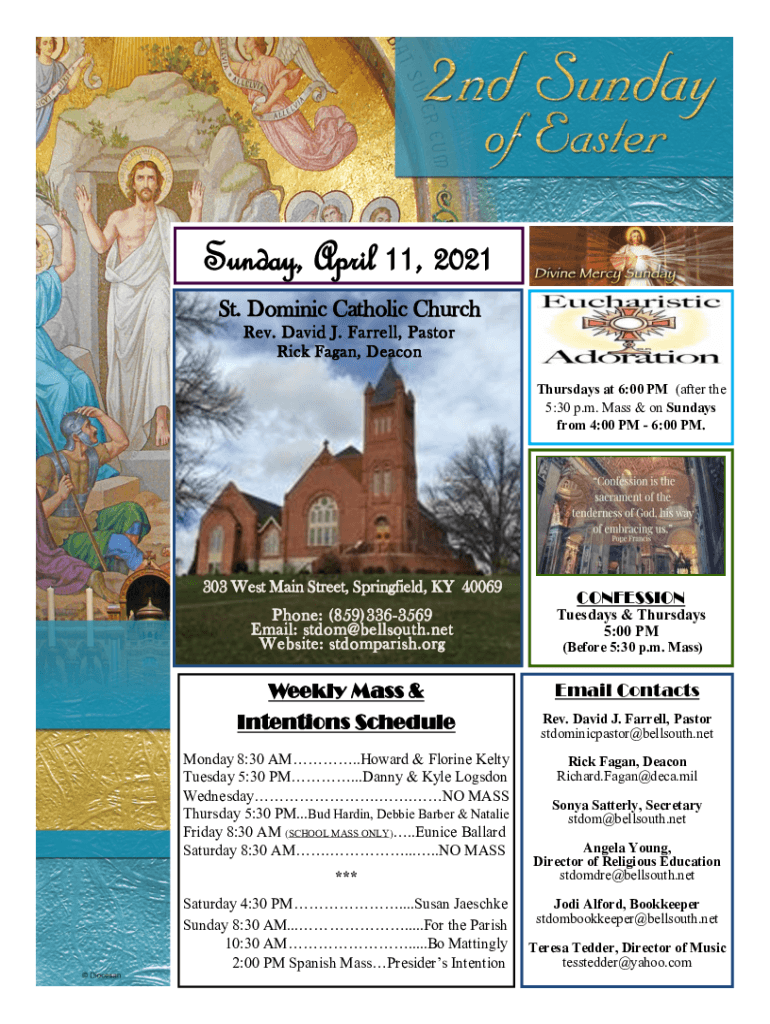 Sunday, April 11, 2021 St. Dominic Catholic Church Rev. David J. Farrell, Pastor Rick Fagan, Deacon Thursdays at 6:00 PM (after the 5:30 p.m. Mass & on Sundays from 4:00 PM 6:00 PM.303 West Main Street,