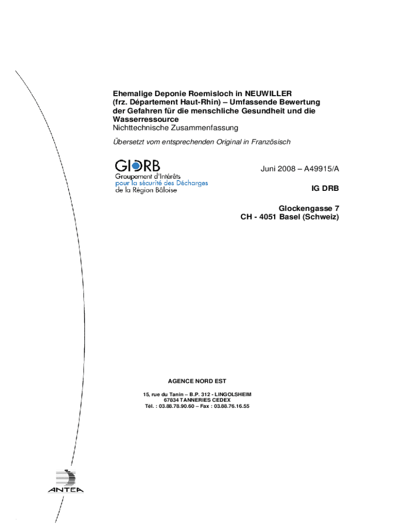 Ehemalige Deponie Roemisloch in NEUWILLER (frz. Dpartement HautRhin) Umfassende Bewertung der Gefahren fr die menschliche Gesundheit und die Wasserressource Nichttechnische Zusammenfassung bersetzt