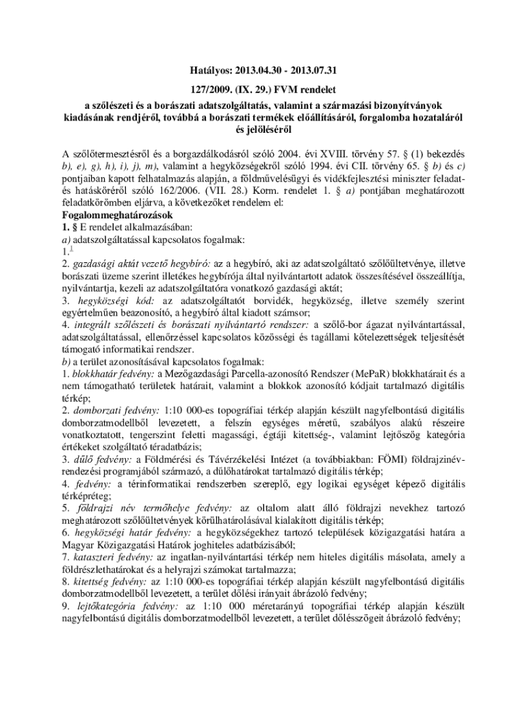 Hatlyos: 2013.04.30 2013.07.31 127/2009. (IX. 29.) FVM rendelet a szlszeti s a borszati adatszolgltats, valamint a szrmazsi bizonytvnyok kiadsnak rendjrl, tovbb a borszati termkek ellltsrl, forgalomba