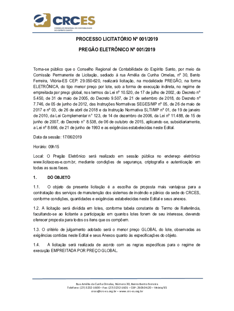 PROCESSO LICITATRIO N 001/2019 PREGO ELETRNICO N 001/2019Tornase pblico que o Conselho Regional de Contabilidade do Esprito Santo, por meio da Comisso Permanente de Licitao, sediado rua Amlia da Cunha