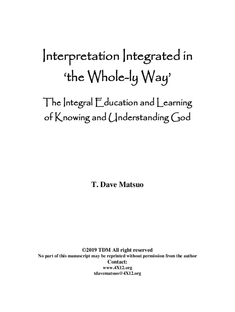Interpretation Integrated in the Wholely Way The Integral Education and Learning of Knowing and Understanding GodT. Dave Matsuo2019 TDM All right reserved No part of this manuscript may be reprinted