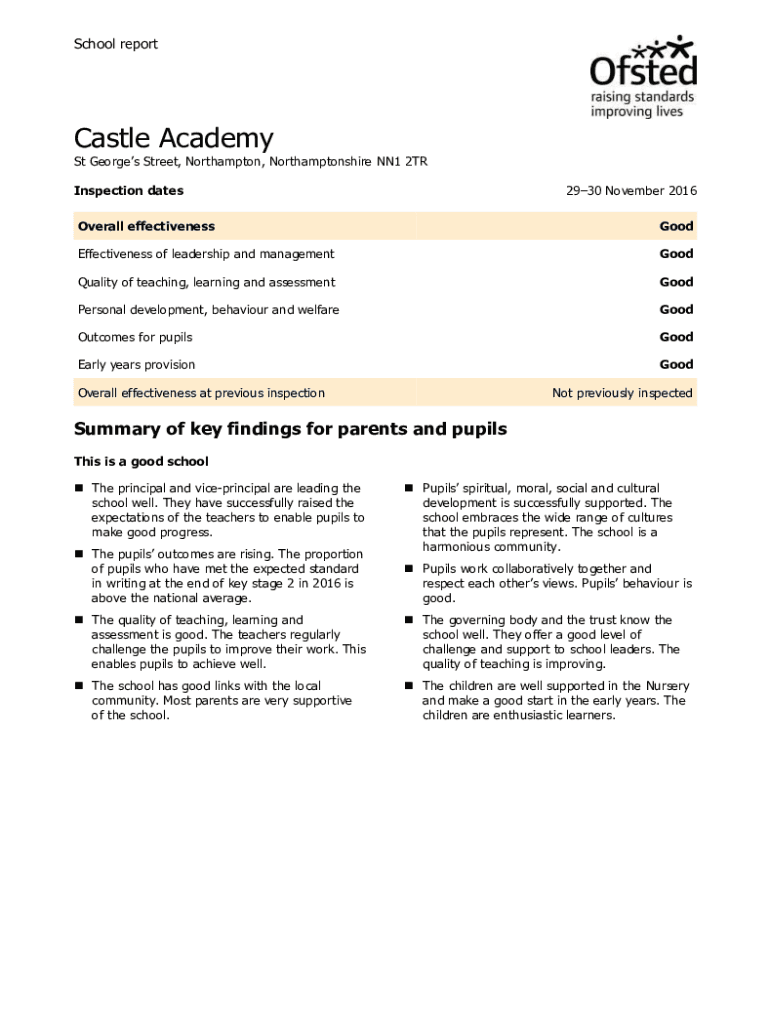 School reportCastle Academy St Georges Street, Northampton, Northamptonshire NN1 2TR Inspection dates2930 November 2016Overall effectivenessGoodEffectiveness of leadership and managementGoodQuality