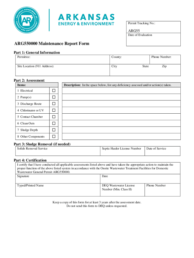 Permit Tracking No.:ARG55 Date of EvaluationARG550000 Maintenance Report Form Part 1: General Information Permittee:County:Site Location (911 Address):CityPhone Number: StateZipPart 2: Assessment
