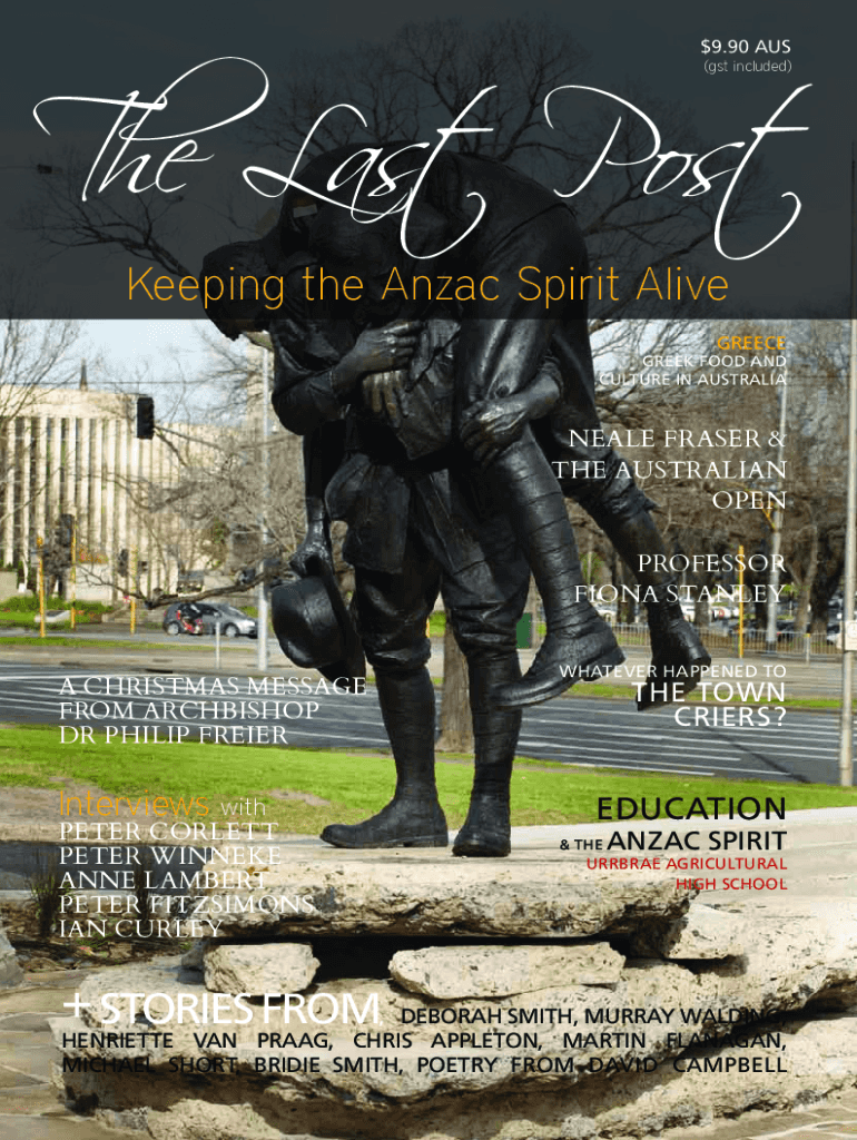 The Last Post $9.90 AUS(gst included)Keeping the Anzac Spirit AlivegreeceGREEK FOOD and culture in australiaNEALE FRASER & THE AUSTRALIAN OPEN PROFESSOR FIONA STANLEY A CHRISTMAS MESSAGE FROM ARCHBISHOP