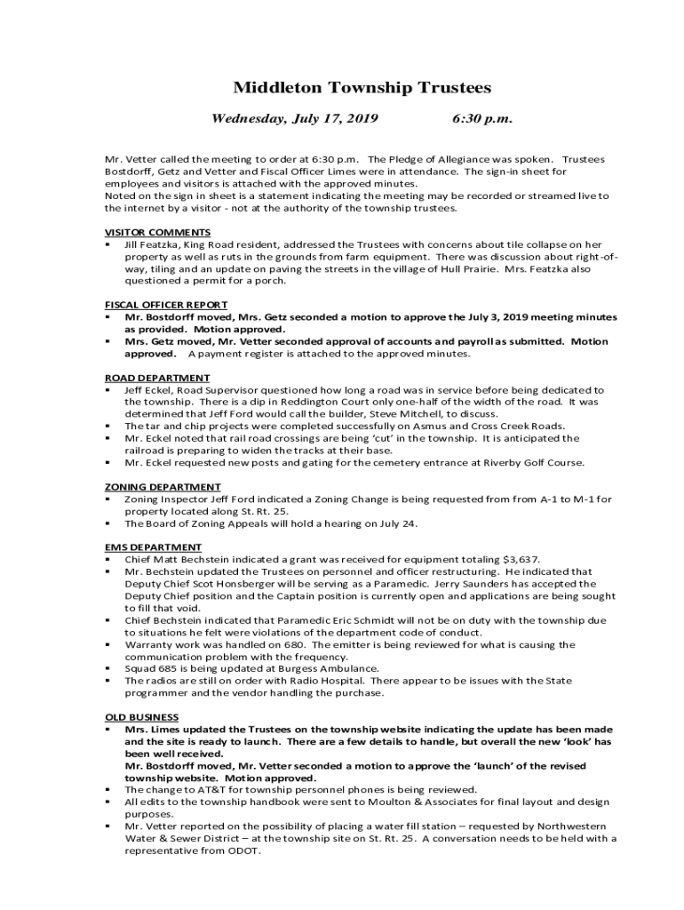 Wednesday, July 17, 20196:30 p.m. Mr. Better called the meeting to order at 6:30 p.m. The Pledge of Allegiance was spoken. Trustees