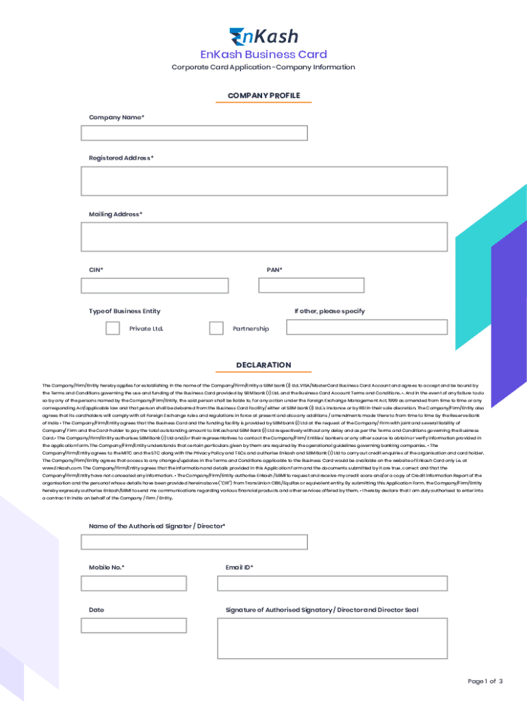 EnKash Business CardCorporate Card Application Company InformationCOMPANY PROFILE Company Name*Registered Address*Mailing Address*PAN*CIN*If other, please specifyType of Business Entity PartnershipPrivate