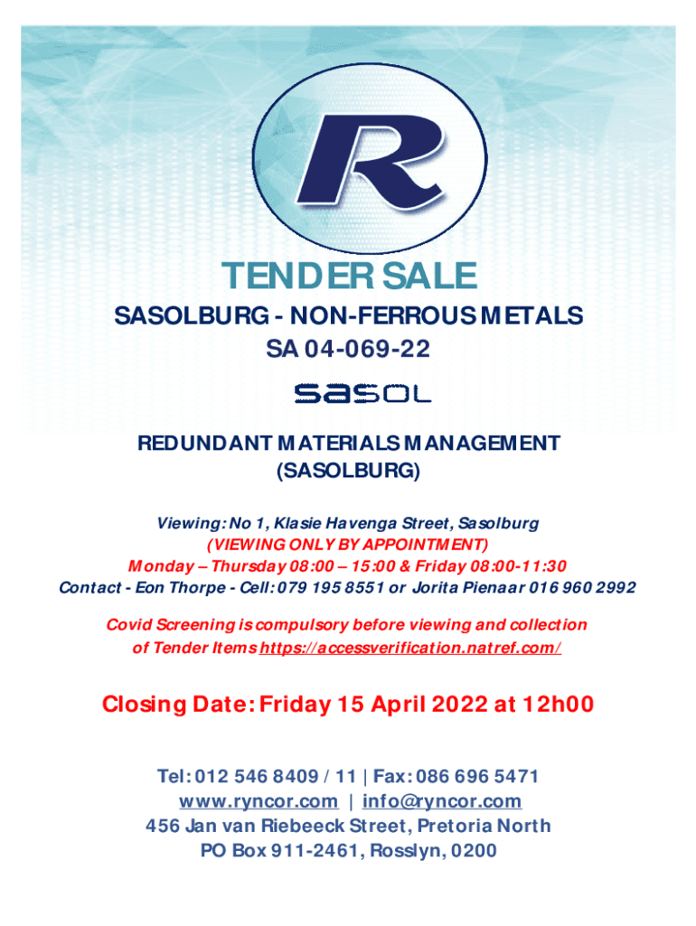 TENDER SALESASOLBURG NONFERROUS METALS SA 0406922 REDUNDANT MATERIALS MANAGEMENT (SASOLBURG) Viewing: No 1, Klasie Havenga Street, Sasolburg (VIEWING ONLY BY APPOINTMENT) Monday Thursday 08:00 15:00