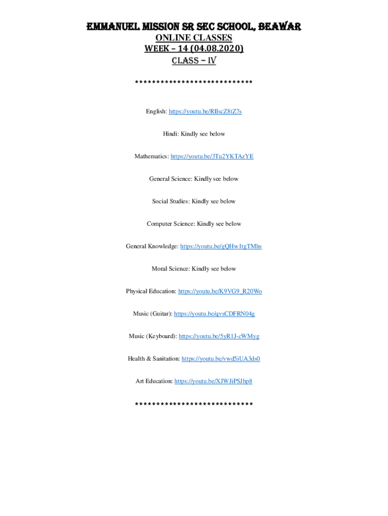 EMMANUEL MISSION SR SEC SCHOOL, BEAWAR ONLINE CLASSES WEEK 14 (04.08.2020) CLASS IV ****************************English: https://youtu.be/RIlscZ8tZ7sHindi: Kindly see belowMathematics: https://youtu.be/3Tu2YKTAzYEGeneral