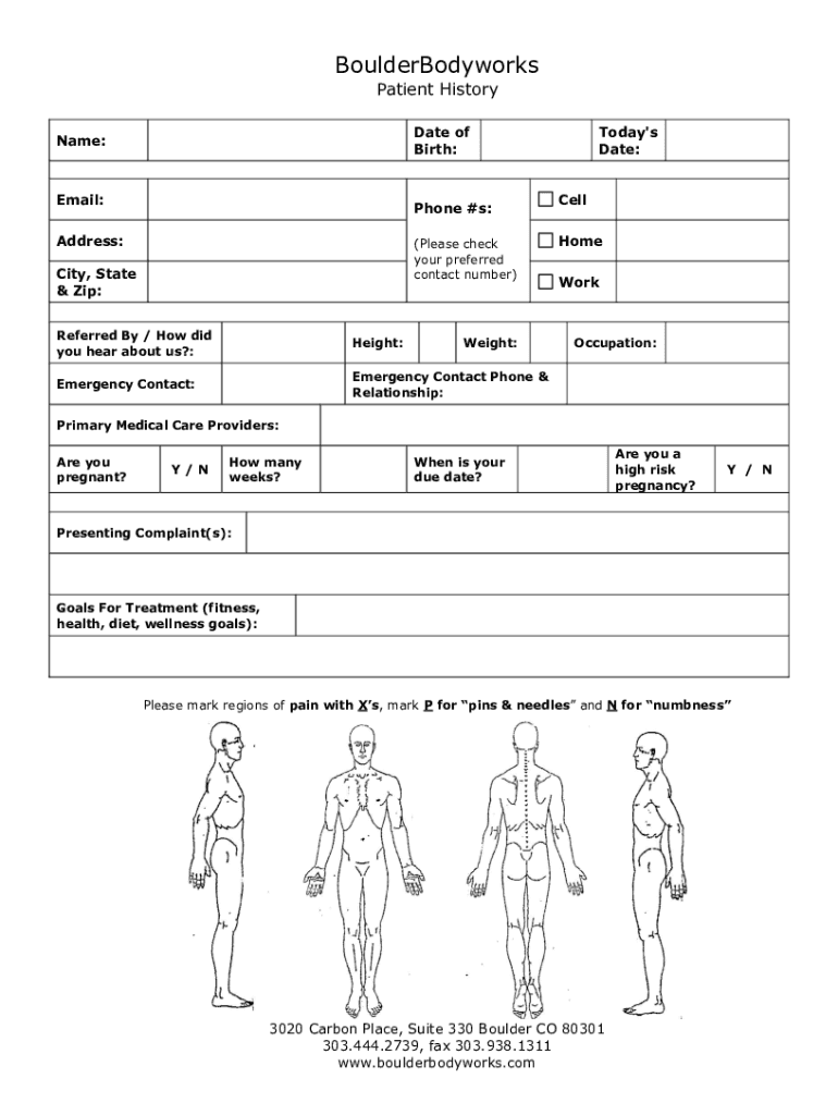 BoulderBodyworks Patient History Date of Birth:Name:Email:Phone #s:Address:(Please check your preferred contact number)City, State & Zip: Referred By / How did you hear about us?:Height:Emergency