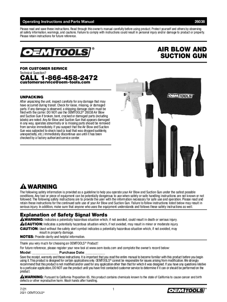 Operating Instructions and Parts Manual26038Please read and save these instructions. Read through this owners manual carefully before using product. Protect yourself and others by observing