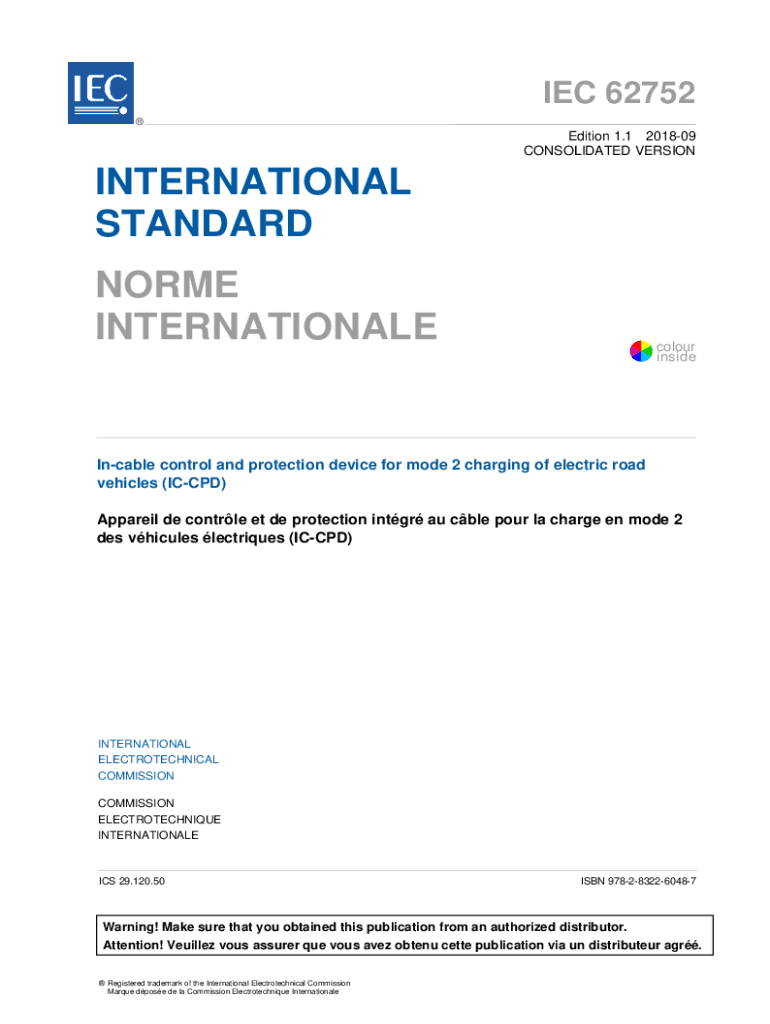 IEC 62752 Edition 1.1 201809 CONSOLIDATED VERSIONINTERNATIONAL STANDARD NORME INTERNATIONALEcolour insideIncable control and protection device for mode 2 charging of electric road vehicles (ICCPD)