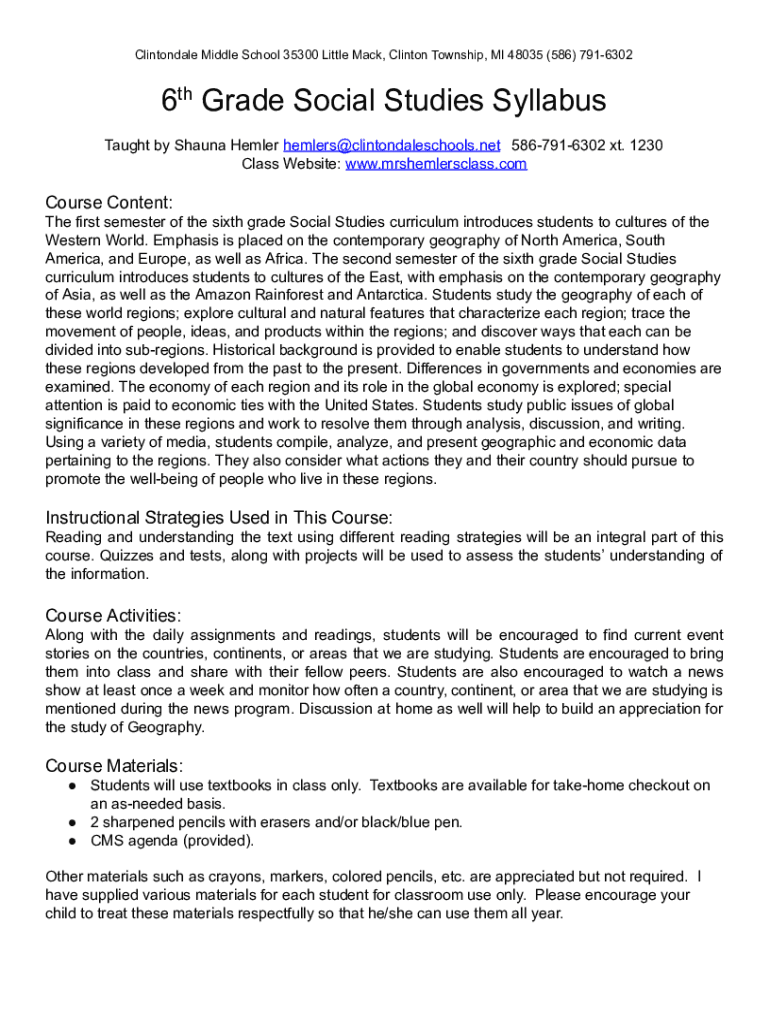 ClintondaleMiddleSchool35300LittleMack,ClintonTownship,MI48035(586)7916302 6thGradeSocialStudiesSyllabus TaughtbyShaunaHemlerhemlers@clintondaleschools.net 5867916302xt.1230 ClassWebsite:www.mrshemlersclass.comCourseContent: