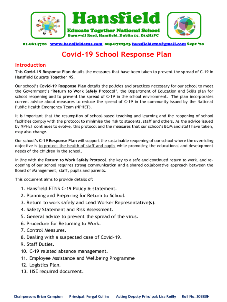 Hansfield Educate Together National School Barnwell Road, Hansfield, Dublin 15. D15H1FC018614720 www.hansfieldetns.com 0858722323 hansfieldetns@gmail.com Sept 20Covid19 School Response Plan Introduction