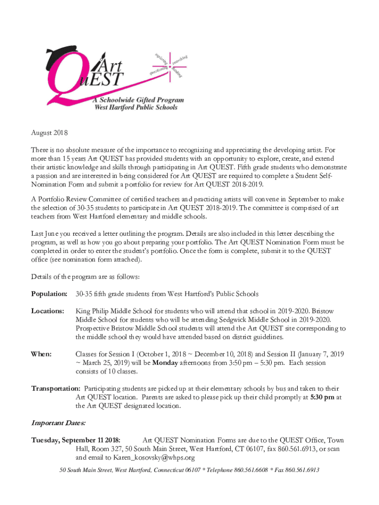 August 2018 There is no absolute measure of the importance to recognizing and appreciating the developing artist. For more than 15 years Art QUEST has provided students with an opportunity to explore,