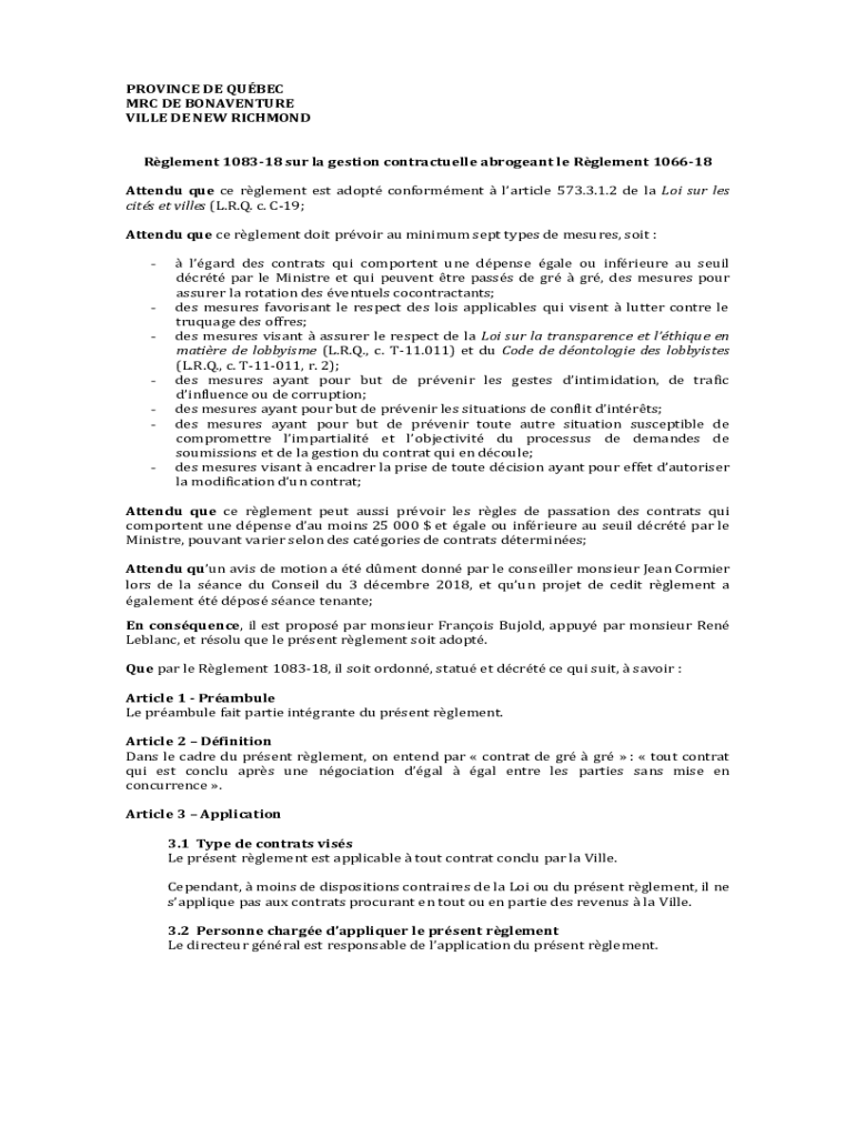 PROVINCE DE QUBEC MRC DE BONAVENTURE VILLE DE NEW RICHMOND Rglement 108318 sur la gestion contractuelle abrogeant le Rglement 106618 Attendu que ce rglement est adopt conformment larticle 573.3.1.2