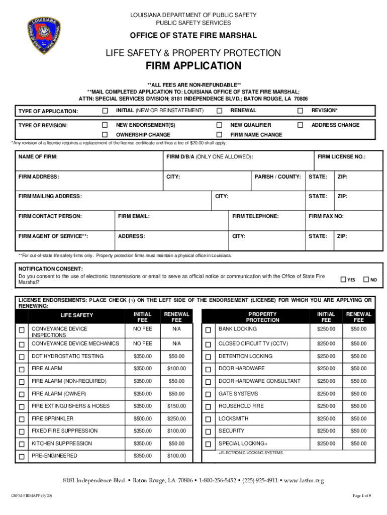 LOUISIANA DEPARTMENT OF PUBLIC SAFETY PUBLIC SAFETY SERVICESOFFICE OF STATE FIRE MARSHALLIFE SAFETY & PROPERTY PROTECTIONFIRM APPLICATION **ALL FEES ARE NONREFUNDABLE** **MAIL COMPLETED APPLICATION