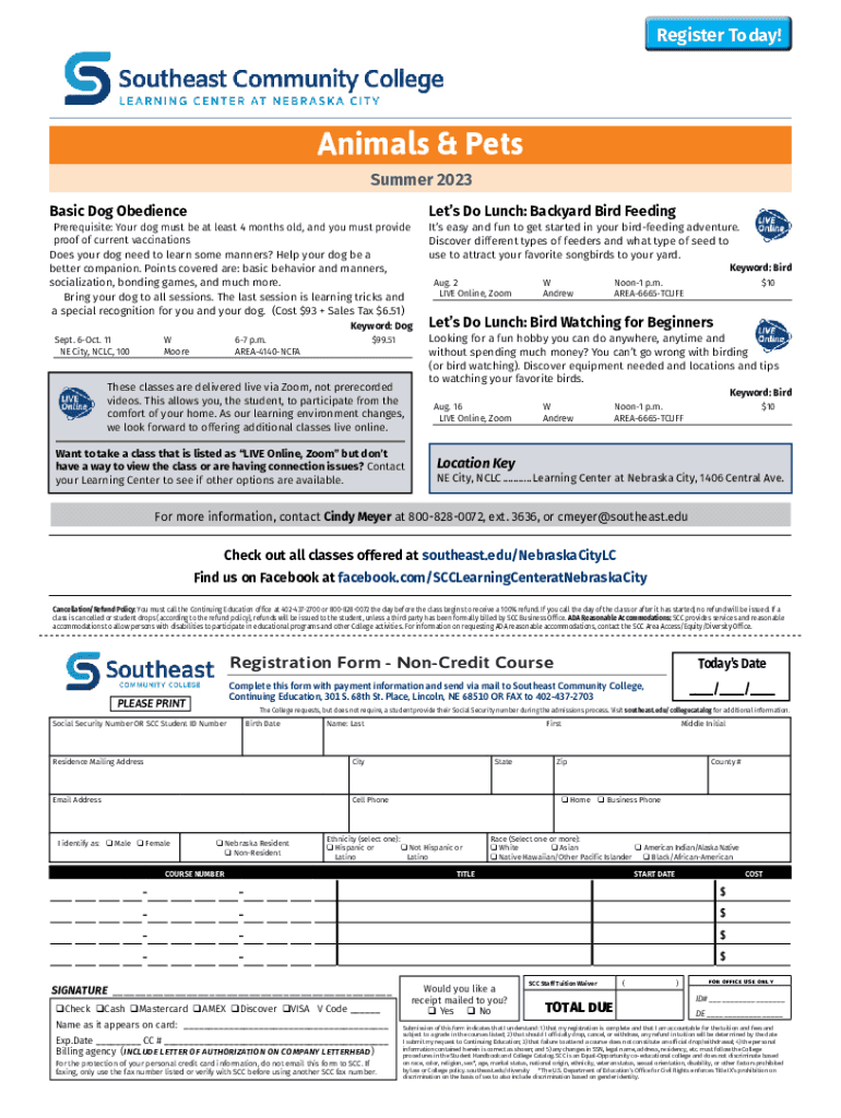 Register Today!Animals & Pets Summer 2023 Basic Dog ObediencePrerequisite: Your dog must be at least 4months old, and you must provide proof of currentvaccinations Does your dog need to learn some