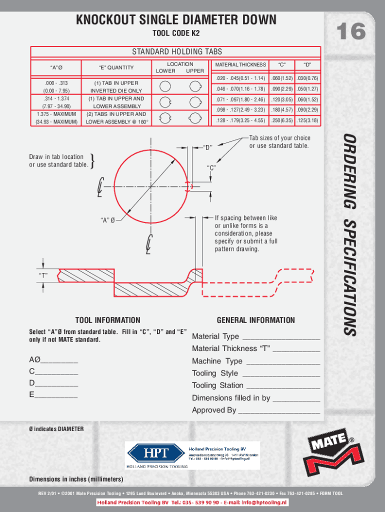 KNOCKOUT SINGLE DIAMETER DOWN16TOOL CODE K2