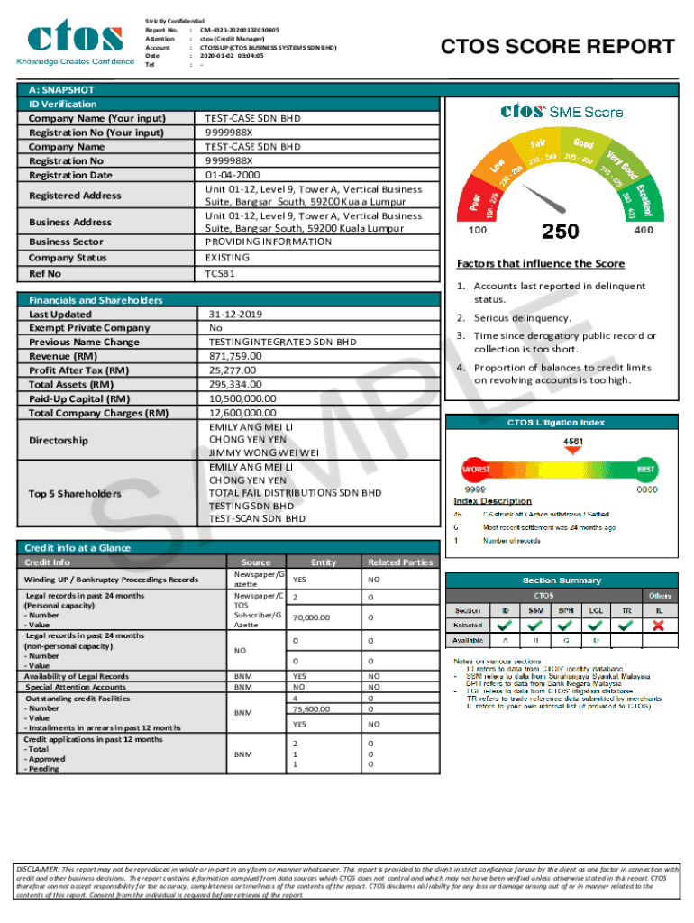 Strictly Confidential Report No. : CM432120200102030405 Attention : ctos (Credit Manager) Account : CTOSSUP (CTOS BUSINESS SYSTEMS SDN BHD) Date : 20200102 03:04:05 Tel : A: SNAPSHOT ID Verification