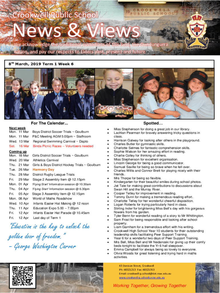 Crookwell Public SchoolNews & Views We acknowledge the traditional custodians of this land, the Gundungurra nation, and pay our respects to Elders past, present and future 8th March, 2019 Term 1 Week