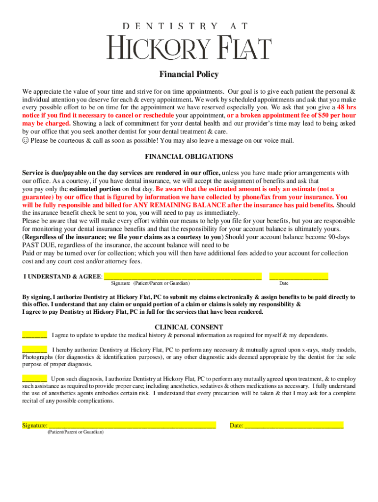 Financial Policy We appreciate the value of your time and strive for on time appointments. Our goal is to give each patient the personal & individual attention you deserve for each & every appointment.