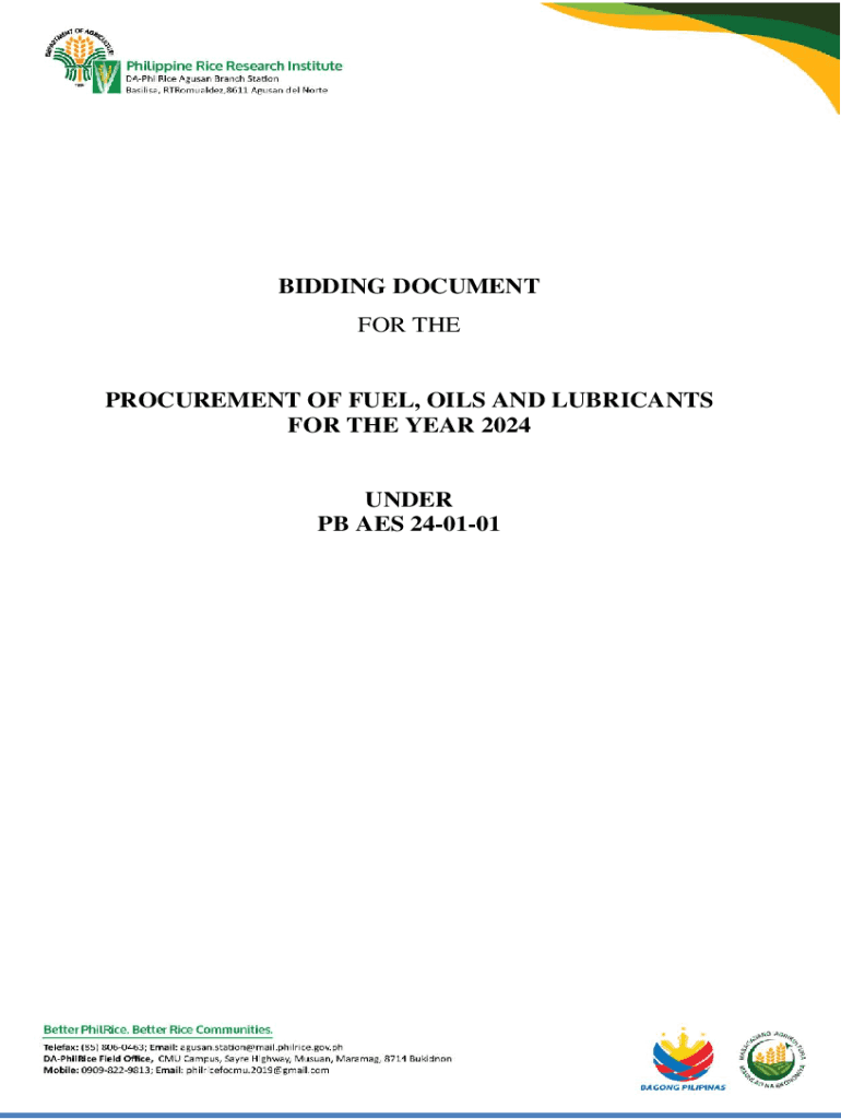 BIDDING DOCUMENT FOR THEPROCUREMENT OF FUEL, OILS AND LUBRICANTS FOR THE YEAR 2024UNDER PB AES 240101Table of Contents Section I. Invitation to Bid..4 Section II. Instructions to Bidders...6 1. 2.
