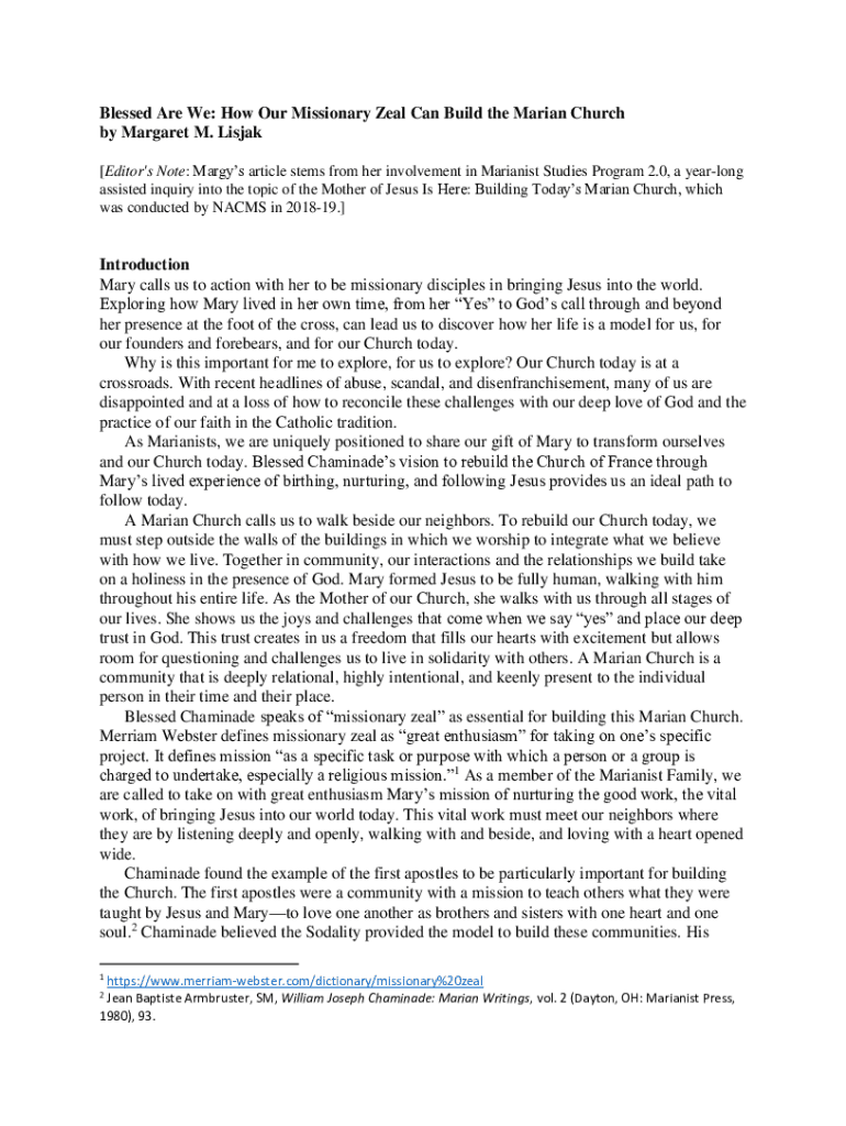 Blessed Are We: How Our Missionary Zeal Can Build the Marian Church by Margaret M. Lisjak [Editor\'s Note: Margys article stems from her involvement in Marianist Studies Program 2.0, a yearlong assisted