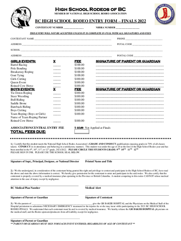High School Rodeos of BC MEMBER OF NATIONAL HIGH SCHOOL RODEO ASSOCIATIONBC HIGH SCHOOL RODEO ENTRY FORM FINALS 2022 CONTESTANT NUMBER ___NHSRA NUMBER ___THIS ENTRY WILL NOT BE ACCEPTED UNLESS IT