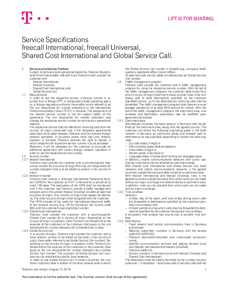 Service Specifications freecall International, freecall Universal, Shared Cost International and Global Service Call. 11.11.2 1.2.11.2.21.2.31.2.4Services provided by Telekom Subject to technical