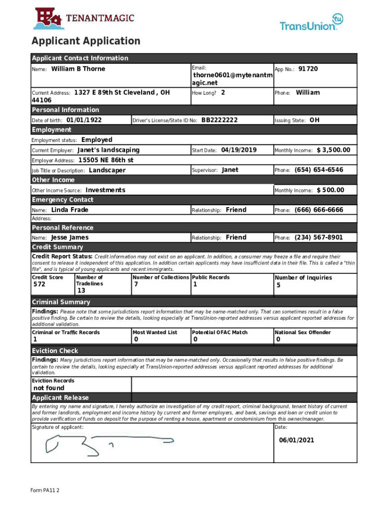 Applicant Application Applicant Contact Information Name:Email:William B ThorneCurrent Address:thorne0601@mytenantm agic.net1327 E 89th St Cleveland , OHHow Long?2App No.:Phone:91720William44106 Personal