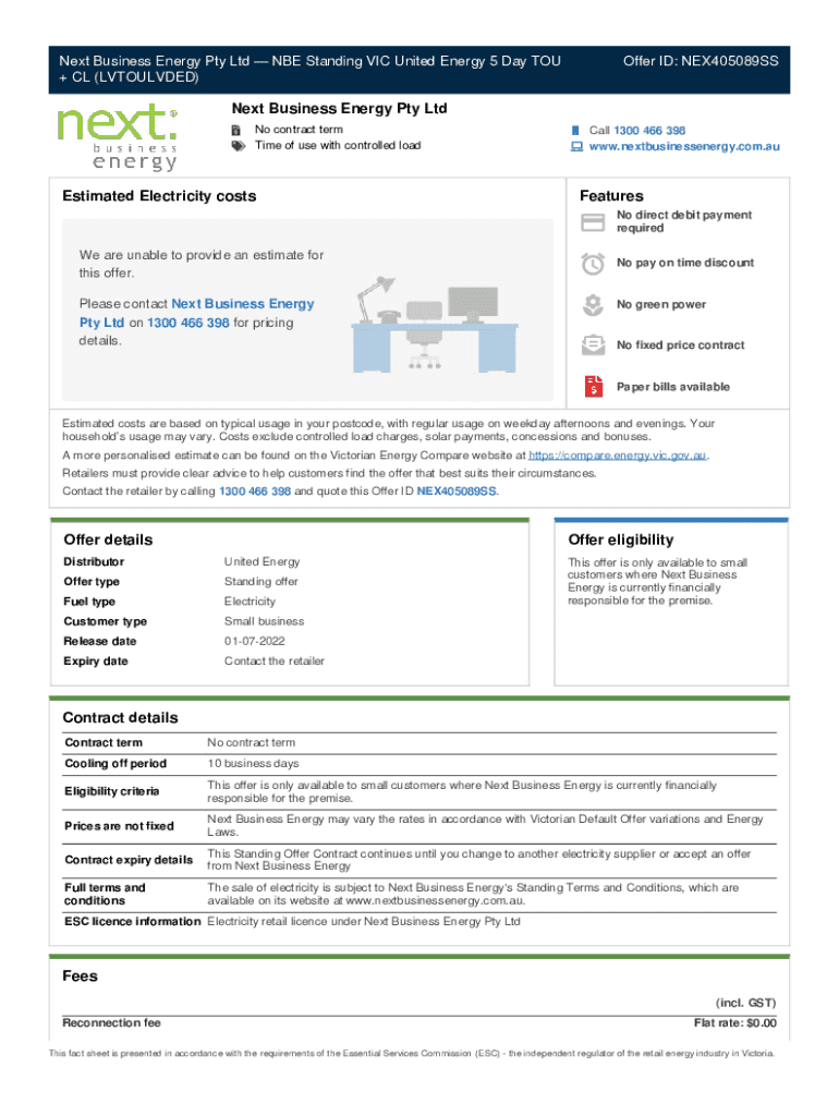 Next Business Energy Pty Ltd NBE Standing VIC United Energy 5 Day TOU + CL (LVTOULVDED)Offer ID: NEX405089SSNext Business Energy Pty Ltd No contract term Time of use with controlled loadEstimated