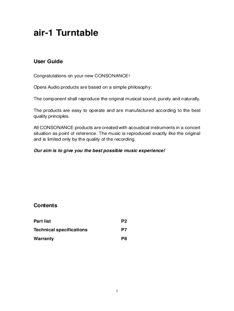 air1 Turntable User Guide Congratulations on your new CONSONANCE! Opera Audio products are based on a simple philosophy: The component shall reproduce the original musical sound, purely and naturally.