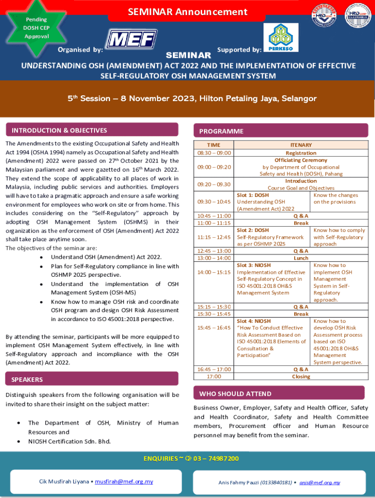 SEMINAR AnnouncementPending DOSH CEP ApprovalOrganised by:Supported by:SEMINAR UNDERSTANDING OSH (AMENDMENT) ACT 2022 AND THE IMPLEMENTATION OF EFFECTIVE SELFREGULATORY OSH MANAGEMENT SYSTEMINTRODUCTION