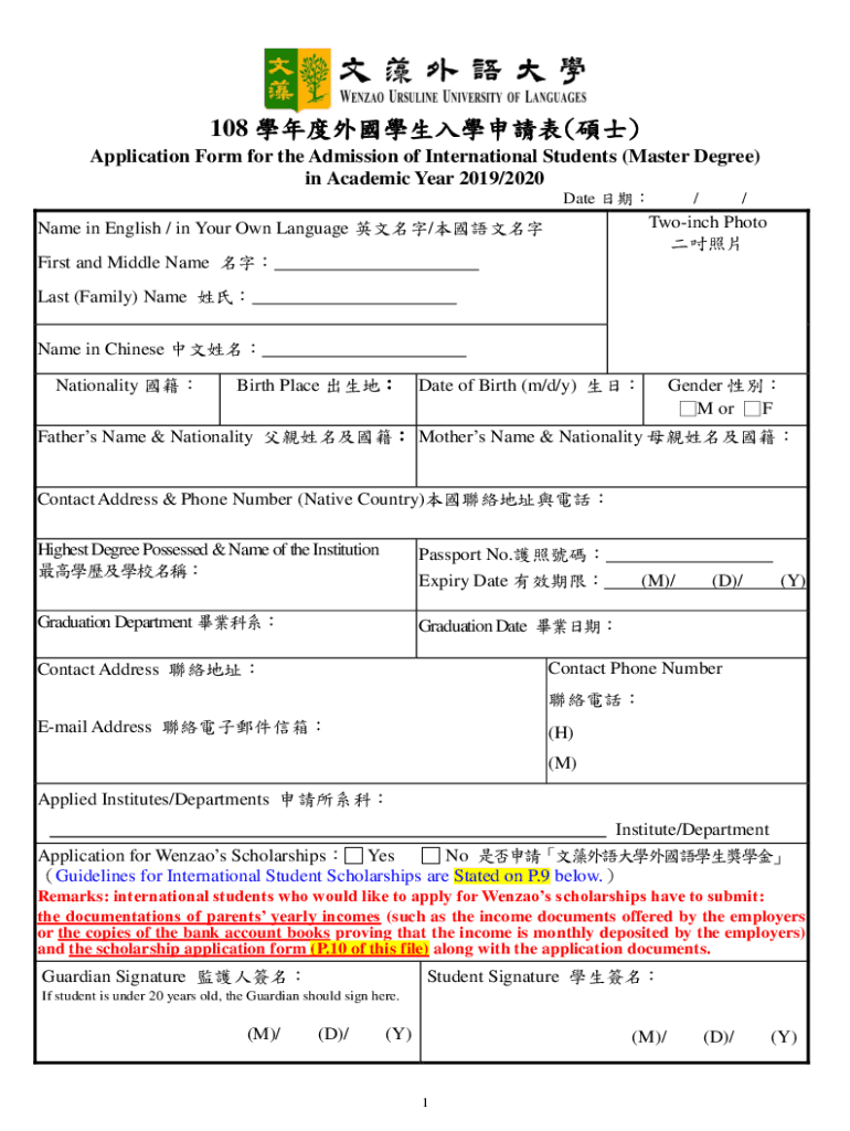 108 () Application Form for the Admission of International Students (Master Degree) in Academic Year 2019/2020 Date //Twoinch Photo Name in English / in Your Own Language / First and Middle Name Last