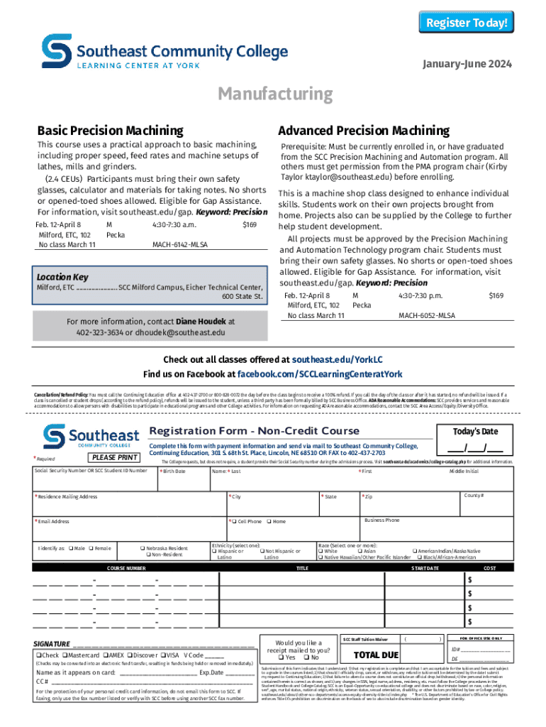 Register Today! JanuaryJune 2024Manufacturing Basic Precision MachiningThis course uses a practical approach to basic machining, including proper speed, feed rates and machine setups of lathes, mills