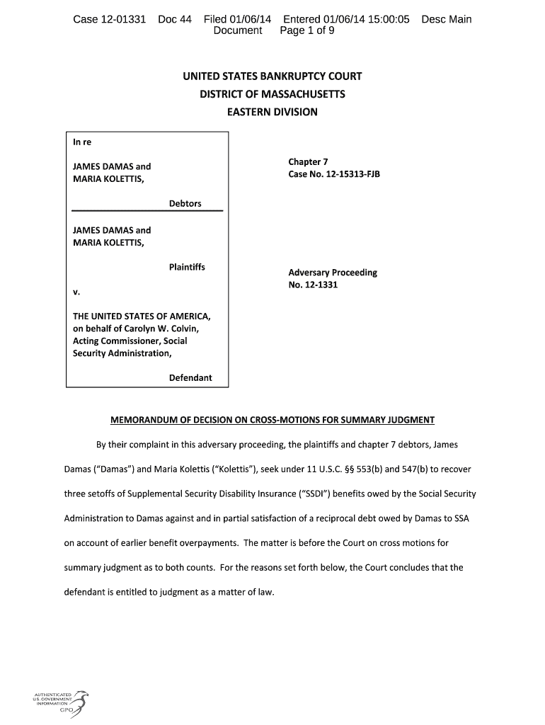 Case 12-01331 Doc 44 Filed 01/06/14 Entered 01/06/14 15:00:05 Document Page 1 of 9 Disc Main UNITED STATES BANKRUPTCY COURT DISTRICT OF MASSACHUSETTS EASTERN DIVISION In re Chapter 7 JAMES DRAMAS