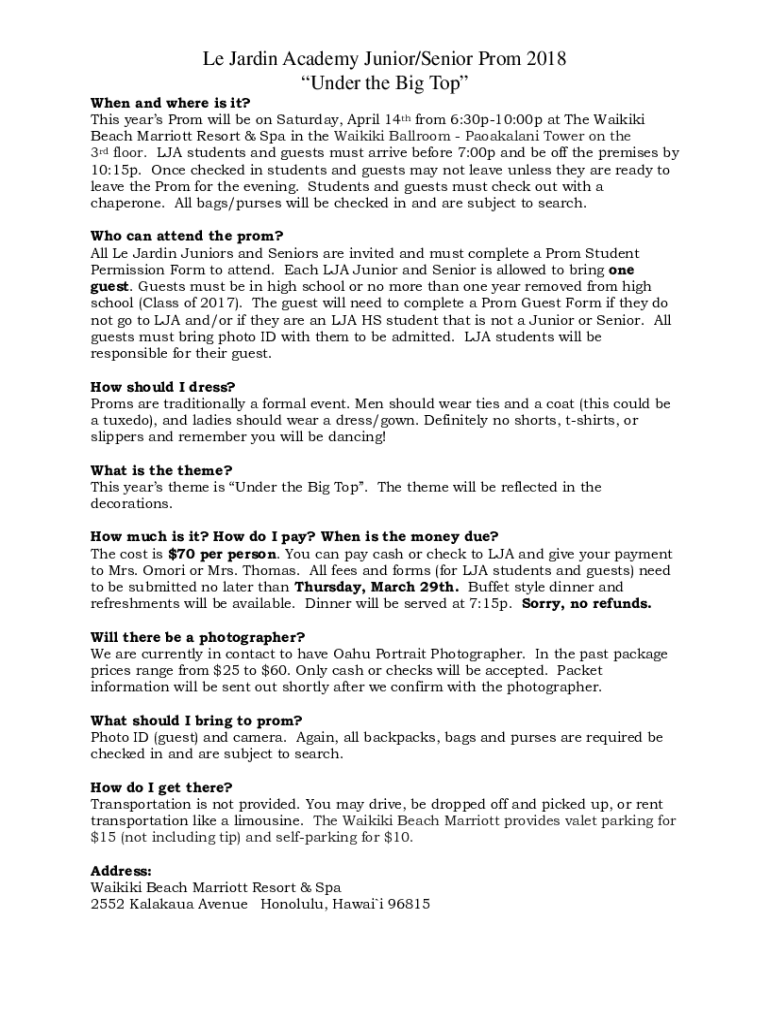 Le Jardin Academy Junior/Senior Prom 2018 Under the Big TopWhen and where is it? This years Prom will be on Saturday, April 14th from 6:30p10:00p at The Waikiki Beach Marriott Resort & Spa in the