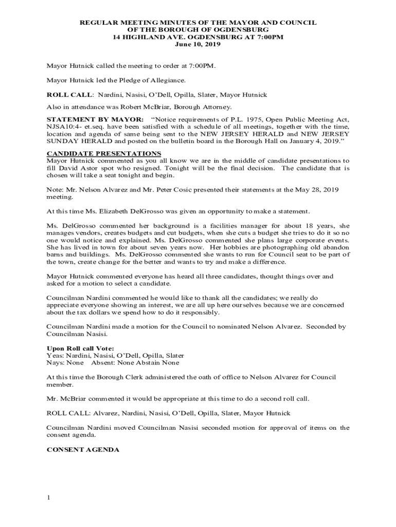 REGULAR MEETING MINUTES OF THE MAYOR AND COUNCIL OF THE BOROUGH OF OGDENSBURG 14 HIGHLAND AVE. OGDENSBURG AT 7:00PM June 10, 2019 Mayor Hutnick called the meeting to order at 7:00PM. Mayor Hutnick