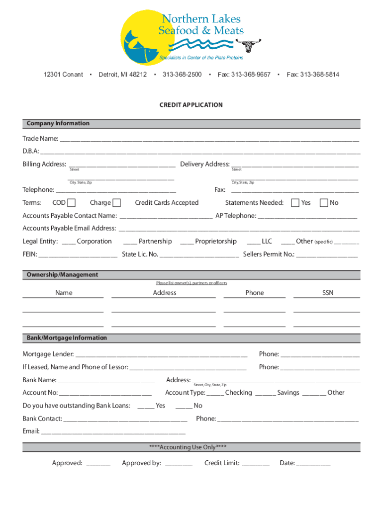 12301 ConantDetroit, MI 482123133682500Fax: 3133689657Fax: 3133685814CREDIT APPLICATION Company InformationTrade Name: ___ D.B.A: ___ Billing Address:___Delivery Address: ___ StreetStreet___City,